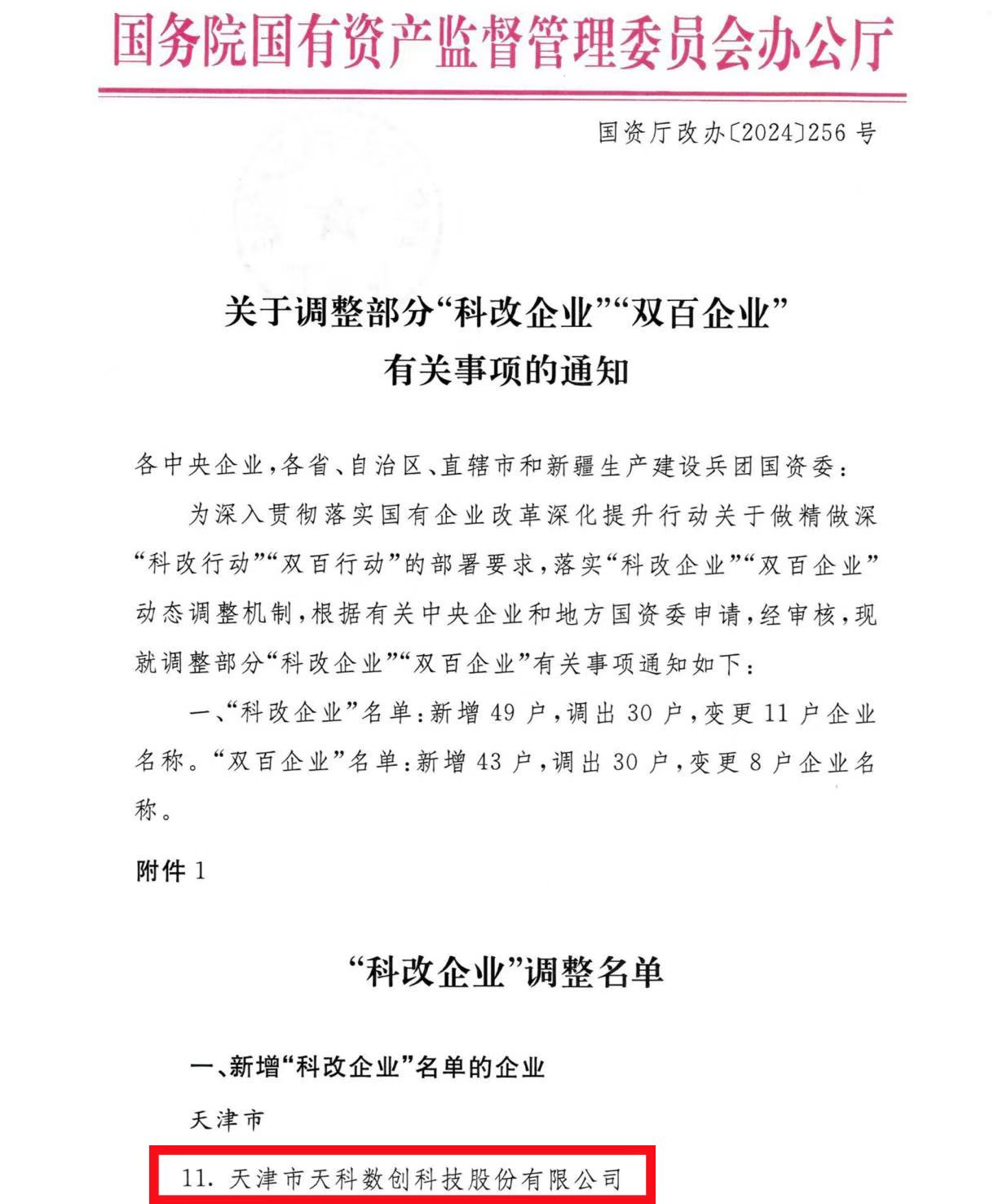 近日,國務(wù)院國資委辦公廳印發(fā)《關(guān)于調(diào)整部分“科改企業(yè)”“雙百企業(yè)”有關(guān)事項(xiàng)的通知》,我司天津市天科數(shù)創(chuàng)科技股份有限公司(以下簡稱“天科數(shù)創(chuàng)”)成功入圍 “科改企業(yè)”名單。
